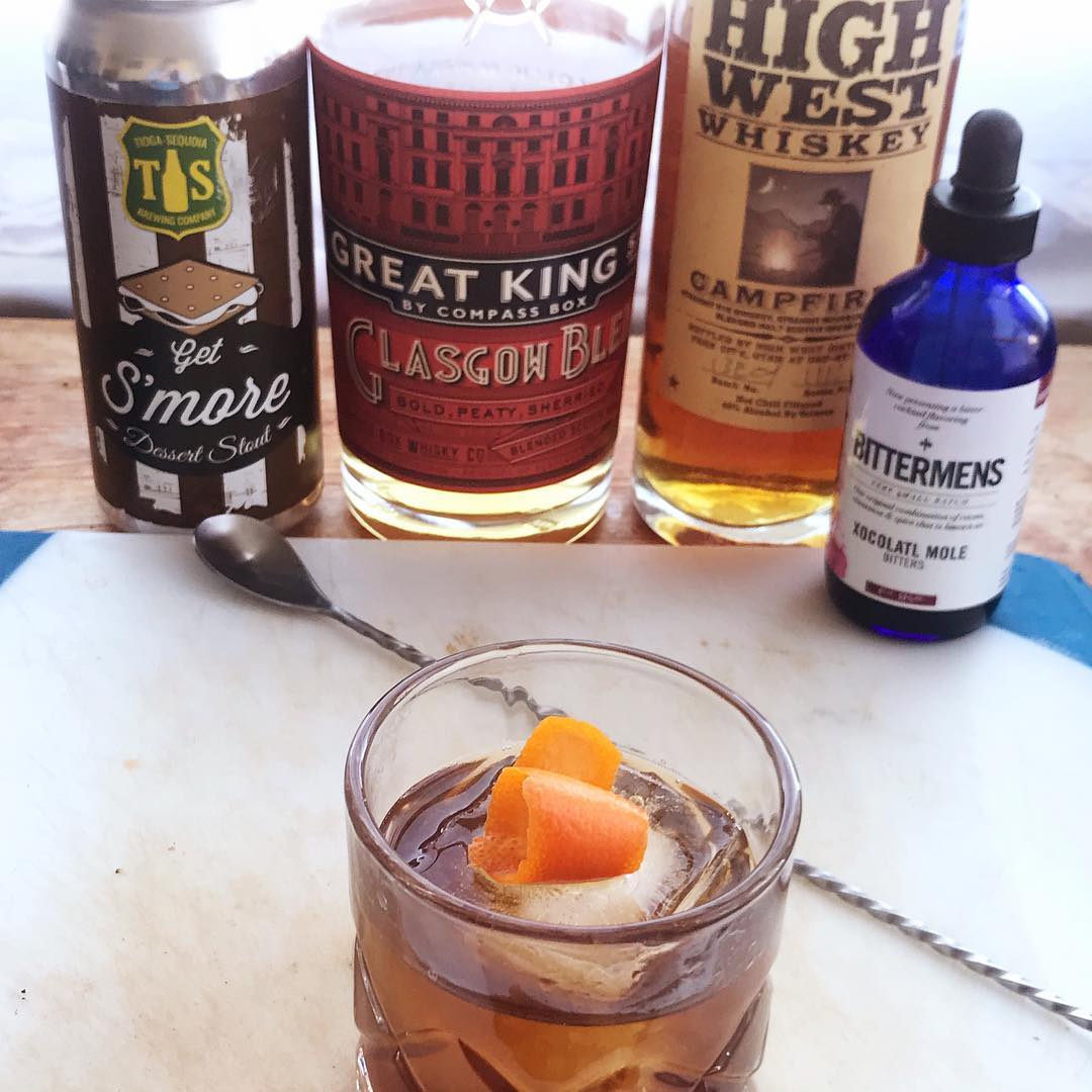 The addition of High West’s Campfire whiskey (a blend of bourbon, rye, and Islay scotch) adds some smoke and spice to the honey, malt, and subtle peat in the blended scotch. Meanwhile, an Imperial Stout reduction/syrup(from a dessert stout inspired by s’mores) rounds out the edges of the drink while boosting the graham cracker/marshmallow/chocolate notes and the Chocolate Mole bitters add a hint of spice while tying everything together