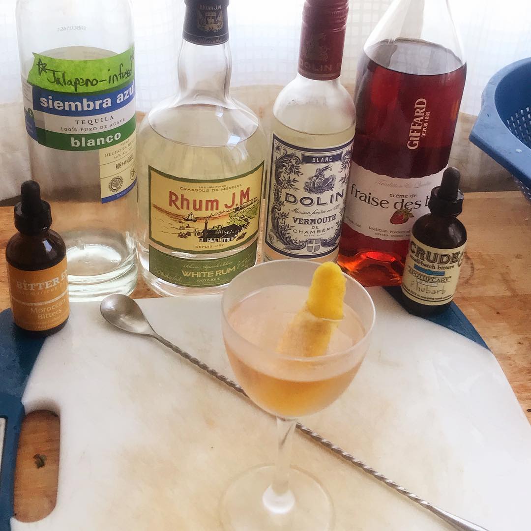 The vegetal notes in the Agricole Rhum and jalapeño-infused tequila work really well with the hint of strawberry. The Blanc vermouth rounds things out