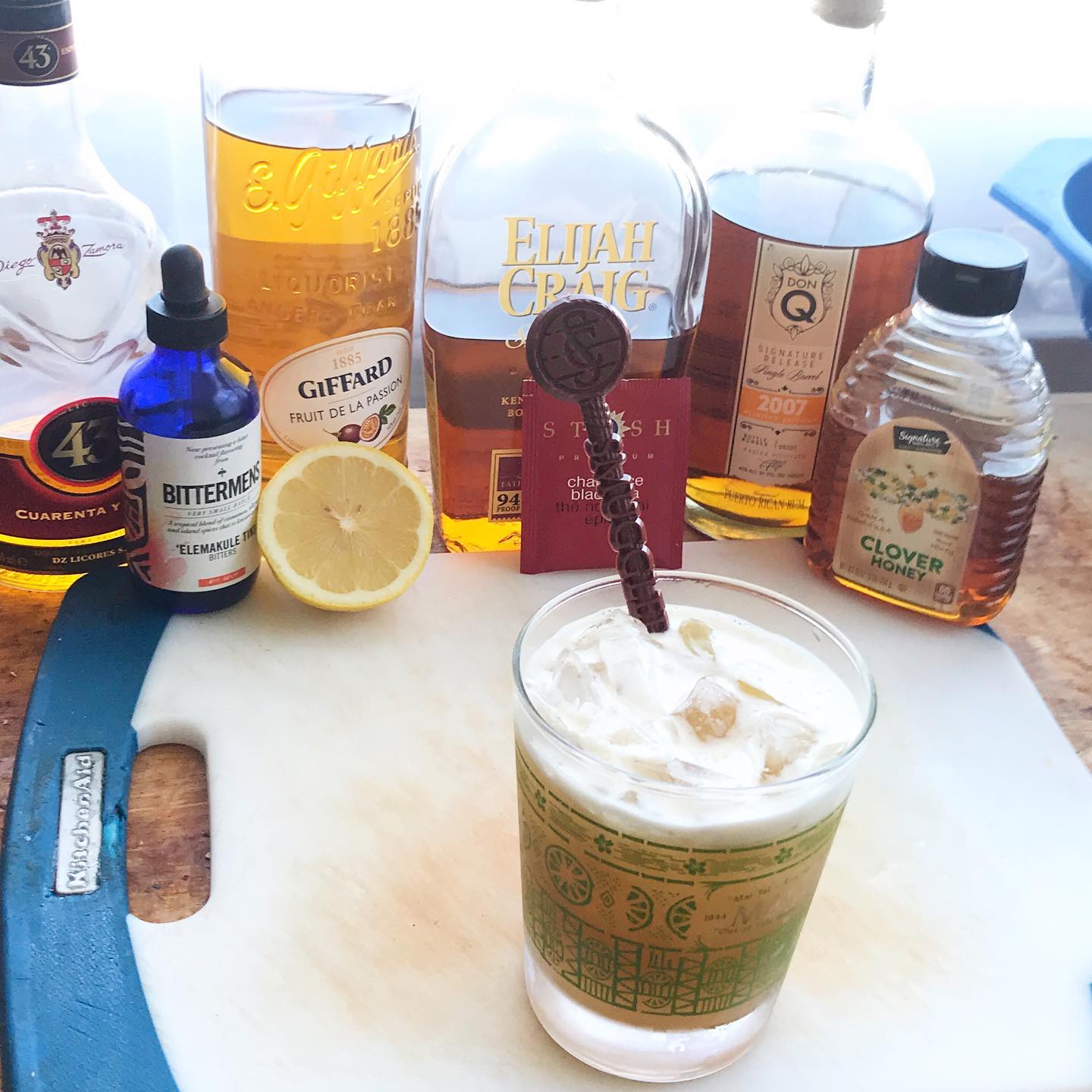 The spices in the chai tea work wonderfully with the baking spice, vanilla, and oak notes in the bourbon, while the drier column still aged rum adds comforting notes of caramelized sugar. The honey and lemon are classic pairings with tea and the tart/sweet notes of the passionfruit provide a nice counterpoint. The splash of vanilla liqueur and the cinnamon and ginger notes in the Tiki bitters add complementary flavors while the egg white adds body/foam