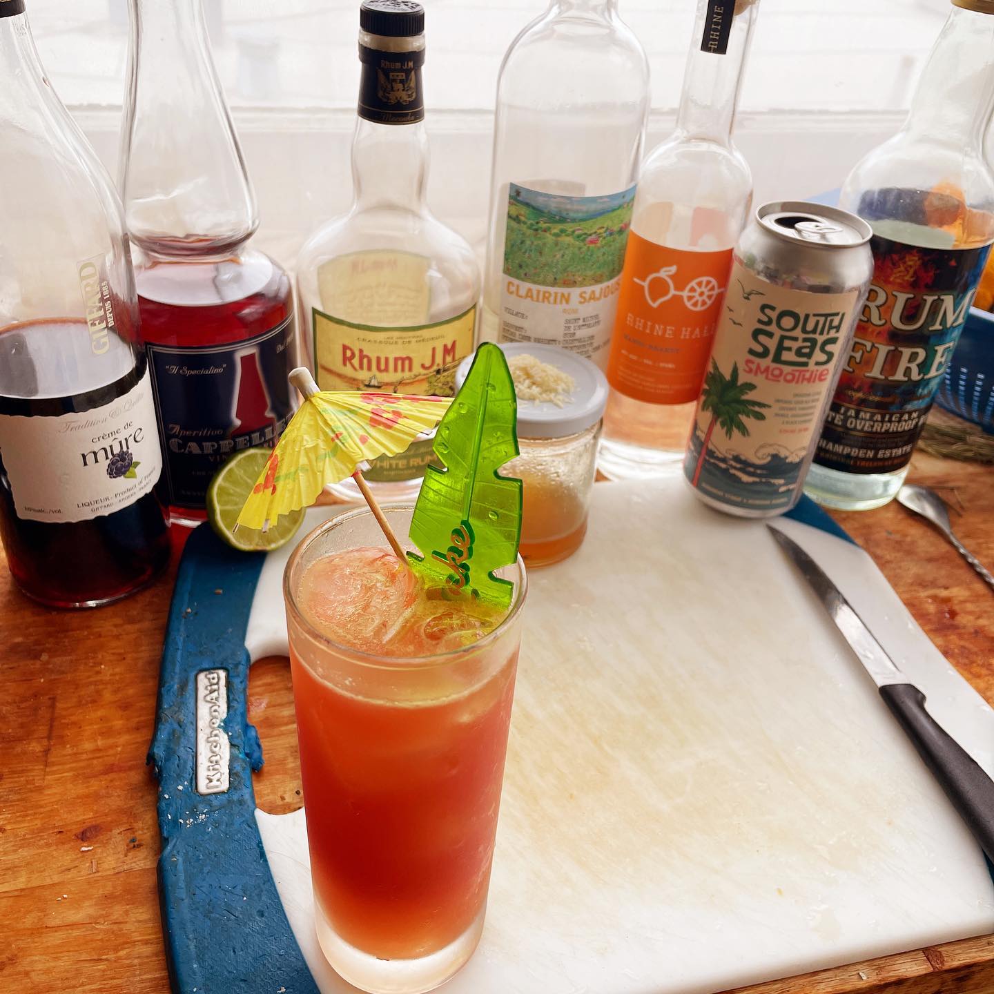 The blend of two sugarcane-based rhums with splashes of Jamaican overproof rum and mango eau de vie creates a base with notes of grassy funk, citrus zest, and tropical fruit that work in great harmony with the tropical fruit-forward sour beer. The chosen bottle of bittersweet aperitivo has some vanilla notes that are nice undertones to the bittersweet note that it brings while also nicely complementing the berry notes in the beer. The citrus zing of the fresh lime juice helps balance the flavors and splashes of blackberry liqueur and toasted coconut syrup help tie the tropical flavors together. Delicious!