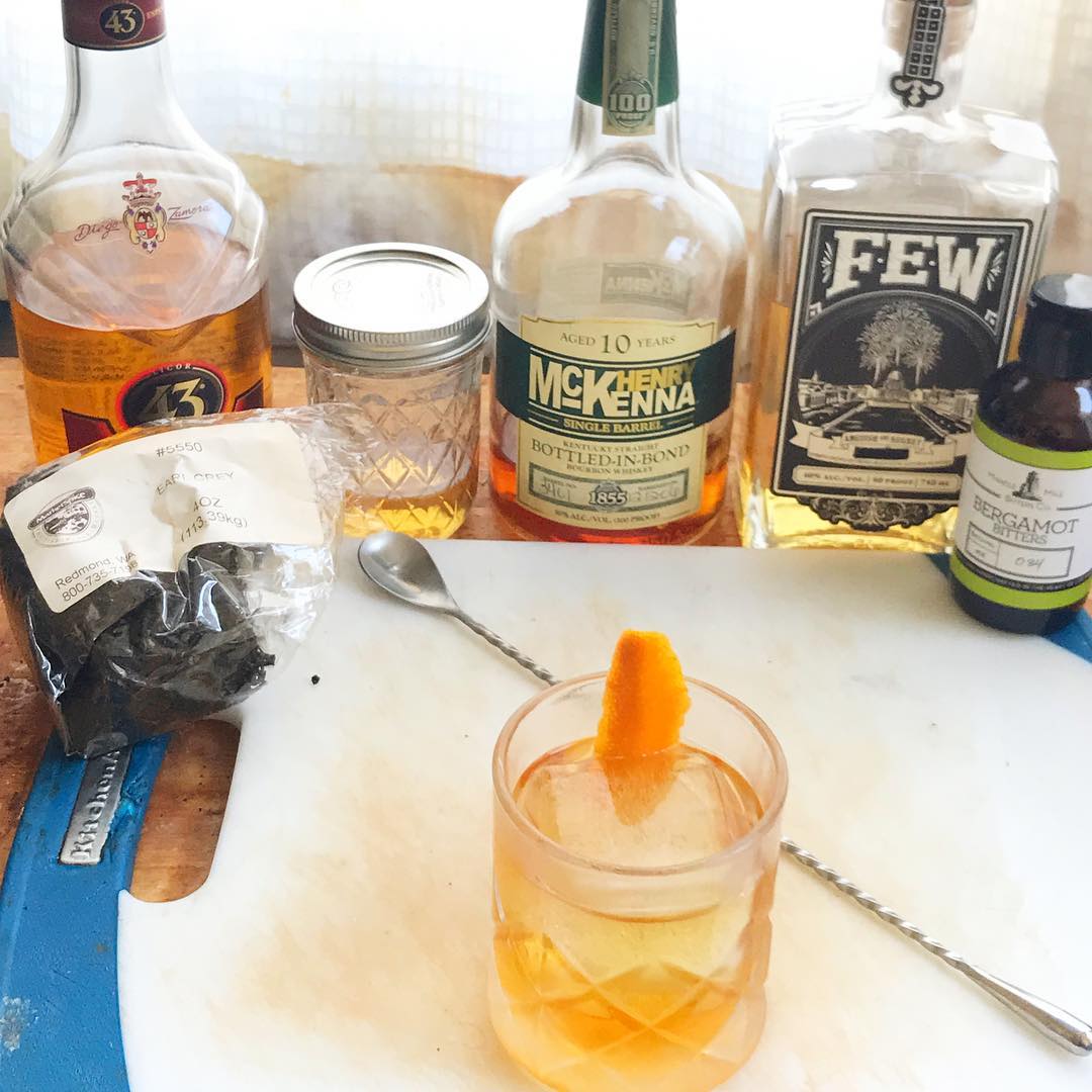 The bergamot and tannic notes in the Earl Grey tea syrup are boosted by the bright Bergamot bitters, the floral/bittersweet Malort, and the orange essential oils from the twist and complemented by the baking spice and oak notes in the bourbon and a subtle undertone of vanilla from the Licor 43