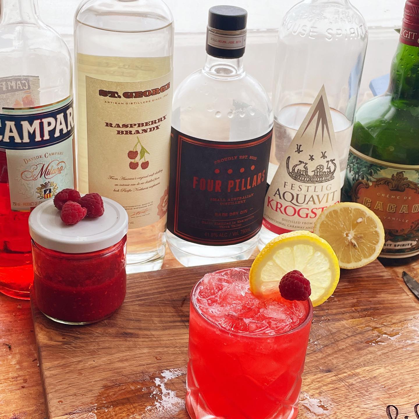The blend of Gin and unaged aquavit leads to a base with notes of juniper, star anise, and hibiscus that complements the tart/subtly sweet raspberry flavor (present in the raspberry syrup and boosted by the raspberry eau de vie). Splashes of Campari and creme de cacao add complementary bittersweet and chocolate notes while also adding body while the lemon adds some citrus zip that goes very well with the raspberry. A perfect drink to highlight raspberry flavor
