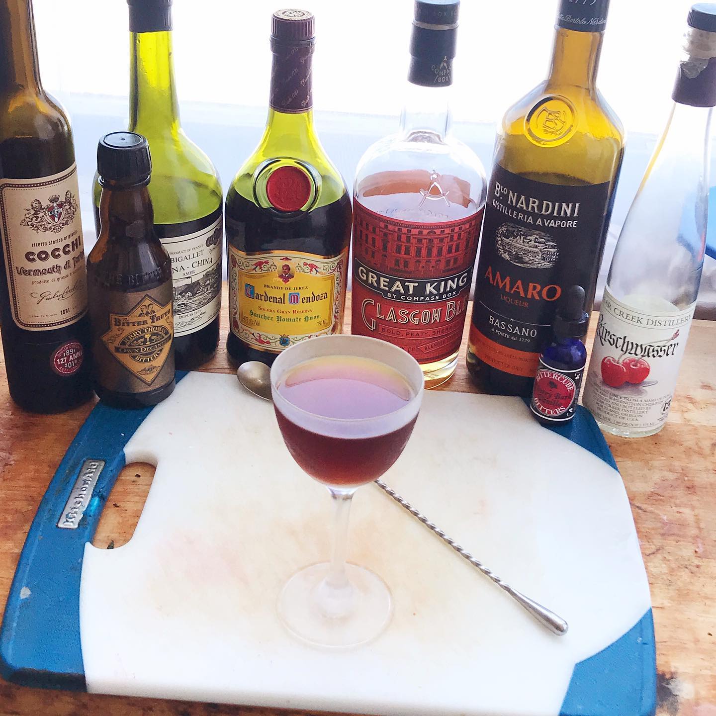 A bold, flavorful Manhattan riff that takes advantage of fine spirits and bitters from France, Spain, Germany, Italy, and (cheating a bit) Scotland 🇫🇷🇪🇸🇩🇪🇮🇹(🏴) The honey, cereal grain, and subtle peat of the scotch marries nicely with the nutty Spanish brandy, the cherry notes from the German cherry eau de vie and bitters, and the orange peel notes in the French Amer and Italian Amaro. The bittersweet notes in the Amer and the bittersweet/milk chocolate notes of the Nardini also serve as a nice counterpoint to the brighter fruit/honey notes elsewhere. The bit of sweet vermouth mitigates a bit of the boozy impact and the Jerry Thomas bitters add a nice baking spice note. A fine after-dinner sipper