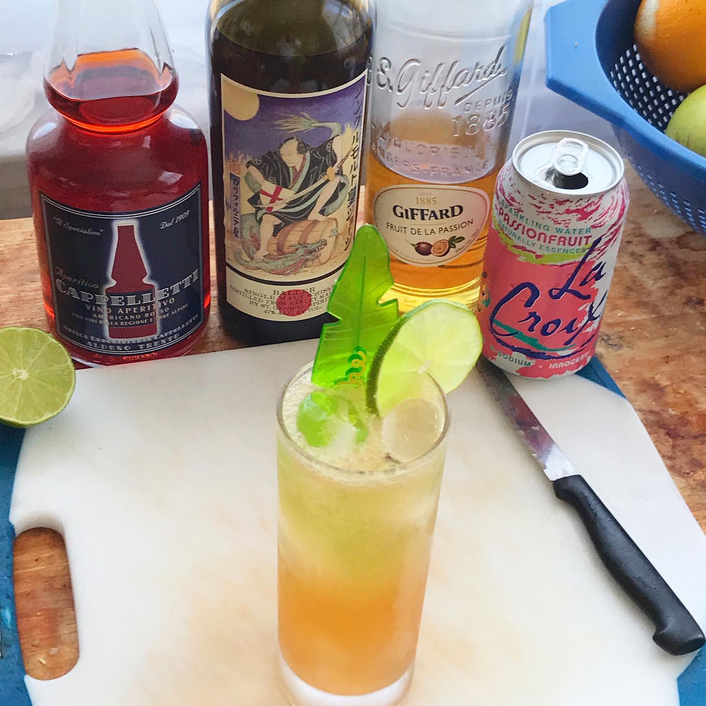 The floral and spice notes in the blended Japanese whisky work nicely with juicy bittersweet notes in the aperitivo while the tart yet sweet passionfruit flavor works nicely with the lime and effervescent soda water to boost the refreshing notes in the drink. A delicious afternoon or pre-dinner drink