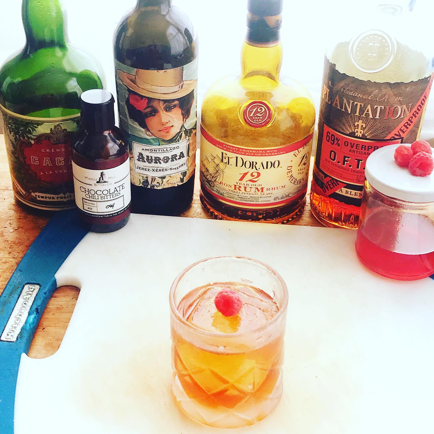 The molasses, cocoa, and coffee notes in the aged and Overproof rums provide a nice canvas that is accented by raspberry (from the syrup), chocolate (from the bitters and splash of creme de cacao), and roasted nuts (from the amontillado sherry). Makes for an excellent nightcap!