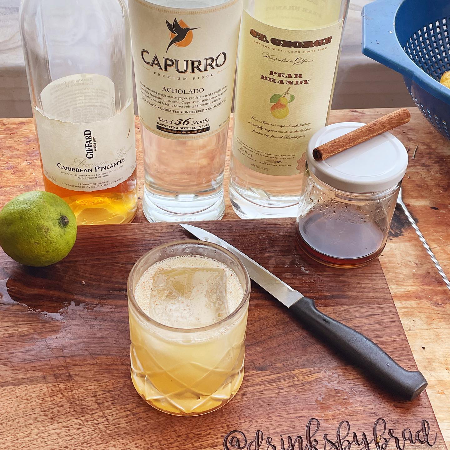 The floral and grape notes in the Pisco (brandy from Peru and Chile) combine with the ripe orchard fruit notes in the pear brandy to create a fruit-forward base with pleasant aromas that works nicely with the acidity of the fresh lime juice and the roasted tropical fruit notes in the pineapple liqueur to create a really tasty drink. A splash of cinnamon syrup and some freshly grated cinnamon adds a complementary baking spice note
