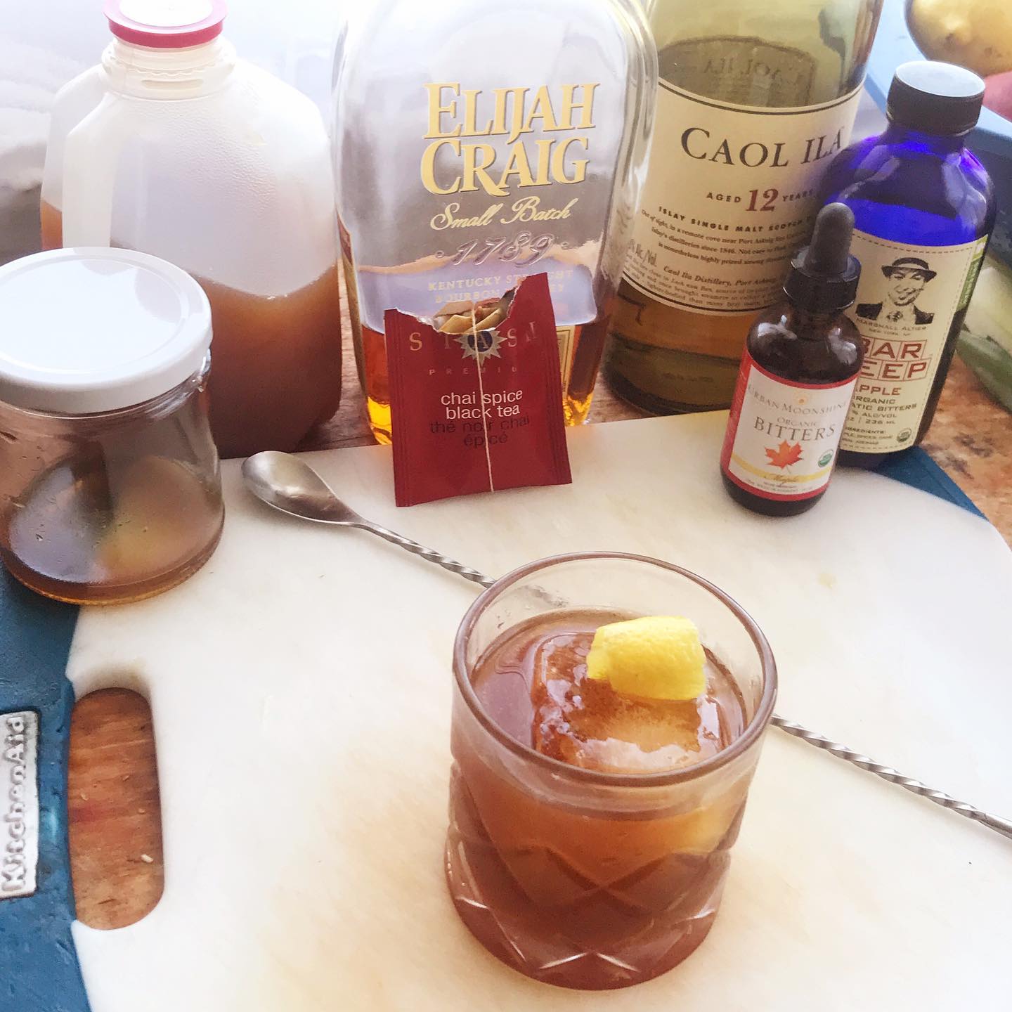 1.5 oz Chai tea-infused Bourbon (steep 1 bag in 2 oz of bourbon for 15-20 minutes; Elijah Craig or Buffalo Trace are good here)