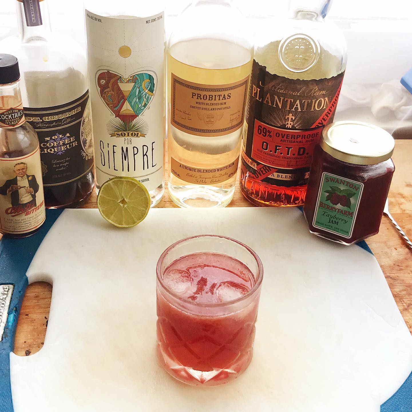 The molasses, dark fruit, and coffee notes in the rum blend provide a great base for the hybrid raspberry/blackberry flavors of the tayberry preserves. The addition of the dusty, slightly vegetal sotol dries out the drink a bit while the lime adds needed acidity and the splash of coffee liqueur and bitters boost the roasted/dark notes and add a hint of spice