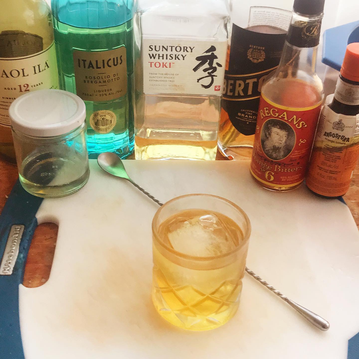 The blended Japanese whisky has notes of spice and subtle honey that work nicely with the caramelized sugar and subtle fruit notes in the American brandy and the floral and citrus notes in the Italian aperitif. The addition of a splash of smoky Islay malt brings notes of black pepper and the orange bitters bring citrus and cardamom notes