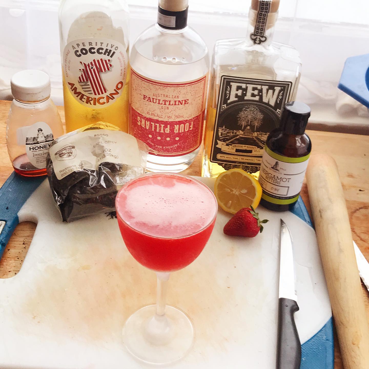 A refreshing, elegant Daiquiri/Sour riff that emphasizes the affinity of gin for Earl Grey tea along with some fresh strawberries just coming into season 🍵🍓🌺 The citrus/tannin/bergamot notes in the black tea work very well with the botanicals used in the gin while the malort contributes floral accents and provides a contrasting bittersweet undertone. The honey/lemon/strawberry flavors work together to provide some complementary notes of acidity, sweetness, and fruit flavor/color while the black tea flavor is boosted by the Bergamot bitters