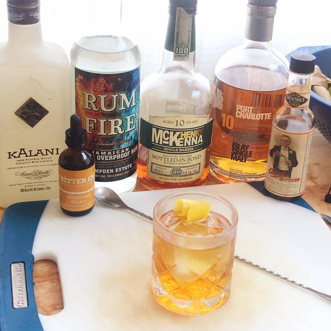 The smoky peat from the Islay Scotch works very well with the rich coconut flavor from the Kalani. The banana/pineapple aromas from the funky, overproof Jamaican rum mingle with the coconut to give tropical notes to a drink that’s normally more straightlaced. The bourbon provides a nice, stable base for the other flavors