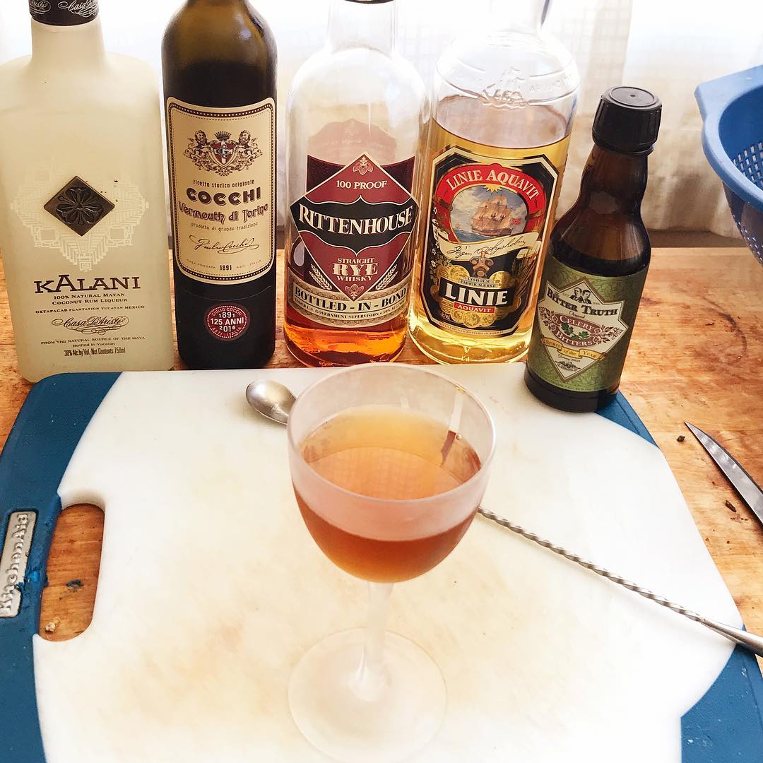 The aquavit adds caraway and dill notes that are amplified by the Celery Bitters and these pair nicely with the Rye spice notes. Meanwhile the bit of coconut liqueur adds a richness and nuance to the cocoa and vanilla notes in the sweet vermouth that play a nice foil with the spices