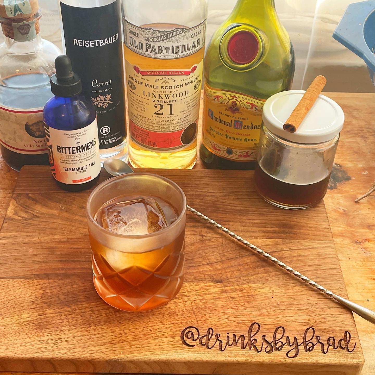 The combination of Speyside scotch and aged Spanish brandy result in a base with flavors of honey, butterscotch, and roasted nuts that provide a nice canvas for the carrot (from Eau de vie) notes. Cinnamon bark syrup and a dash of ginger/baking spice forward bitters contribute complementary spice notes while a bit of walnut liqueur (Nocino) helps highlight the nuttiness in the drink. Would be a great after dinner drink with a slice of carrot cake or a spiced cupcake