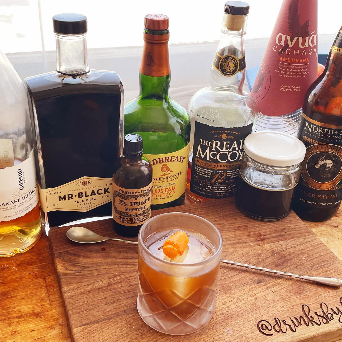 The sherry barrel-aged Irish whiskey has notes of honey and cereal grain with undertones of nuts that combine with the molasses/vanilla/baking spice notes in the aged rum and the tropical fruit and vanilla notes in the aged cachaca to form a flavorful base that highlights the coffee and cocoa notes in the Stout syrup/reduction. Splashes of coffee and banana liqueur and a few dashes of Chicory-Pecan bitters help boost the coffee, banana, and pecan notes present in the blend of spirits in the base. Absolutely delicious!
