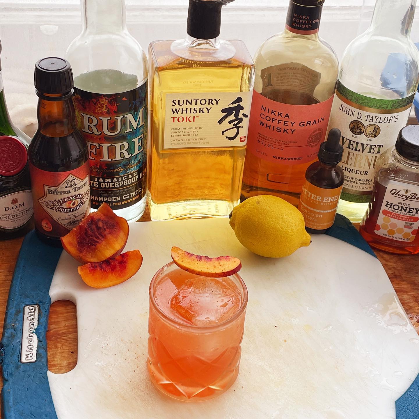 The honey and vanilla custard notes in the blend of Japanese malt and grain whiskies creates a nice platform for the ripe nectarine flavor to show off. The Jamaican rum adds some complementary funk and ripe tropical fruit notes while the blend of honey syrup, Benedictine, and Falernum add notes of baking spice while tying together other flavors. Fresh lemon juice balances the sweetness while adding some zip and the peach and Moroccan bitters help boost the stone fruit and baking spice notes. Like a slice of cobbler in liquid form!