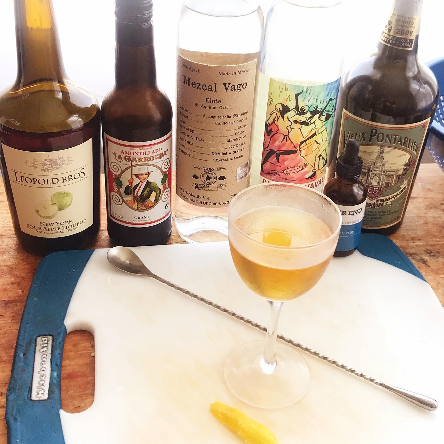 The roasted corn-infused mezcal has a more rounded flavor with a hint of smoke that works nicely with the saline/olive/citrus zest notes in the Haitian sugarcane rhum and the tart green apple notes in the liqueur. The amontillado sherry adds a dry, nutty accent and the bitters and dash of absinthe add some herbal and black pepper accents while the essential oils from the lemon add a nice citrus aroma