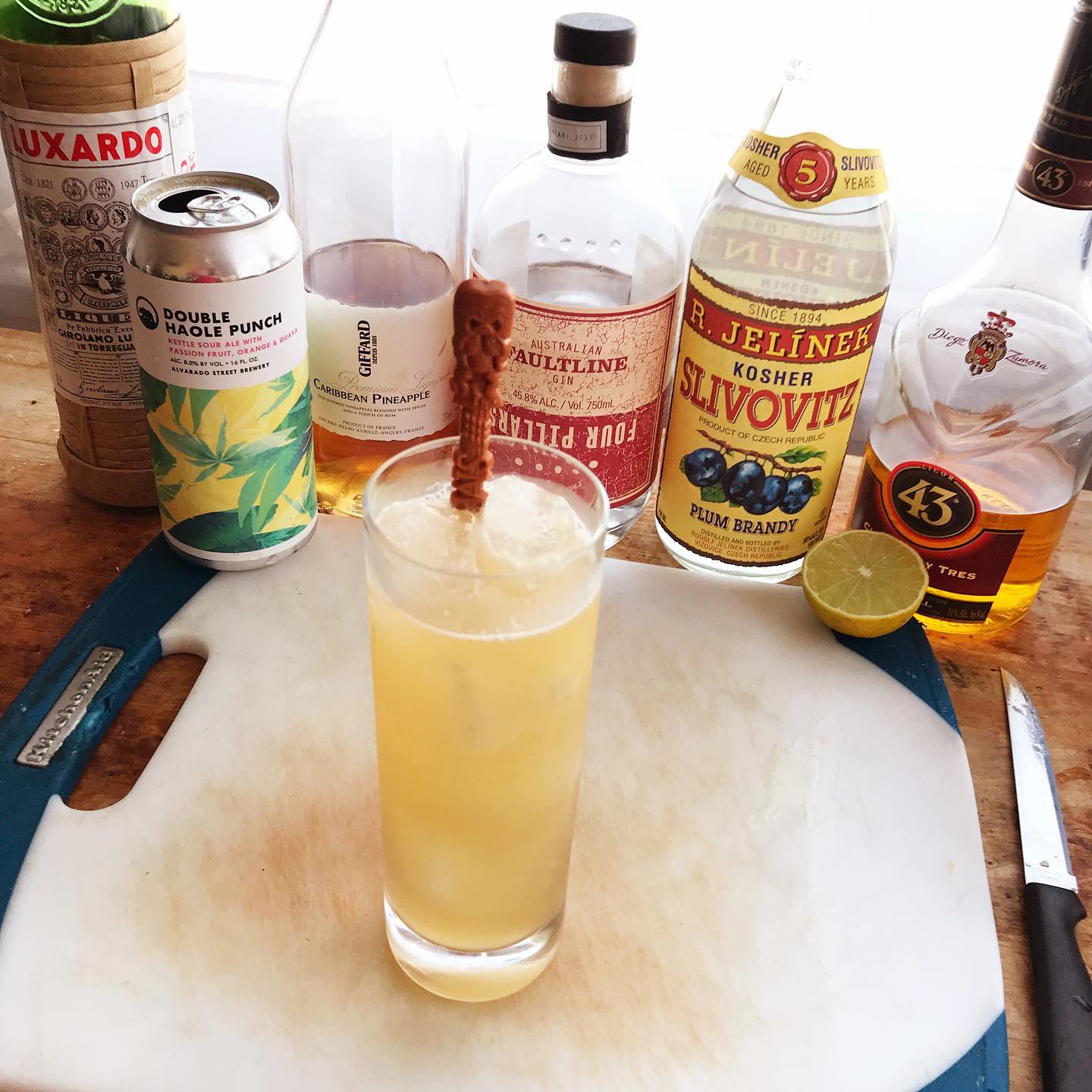 The earthy, funky red/stone fruit notes in the kosher plum brandy (Slivovitz) and Maraschino liqueur work very nicely with the botanical notes in the gin and the tropical passionfruit/orange/guava notes in the sour beer. The splashes of pineapple and vanilla liqueur add notes that complement the other flavors in the drink