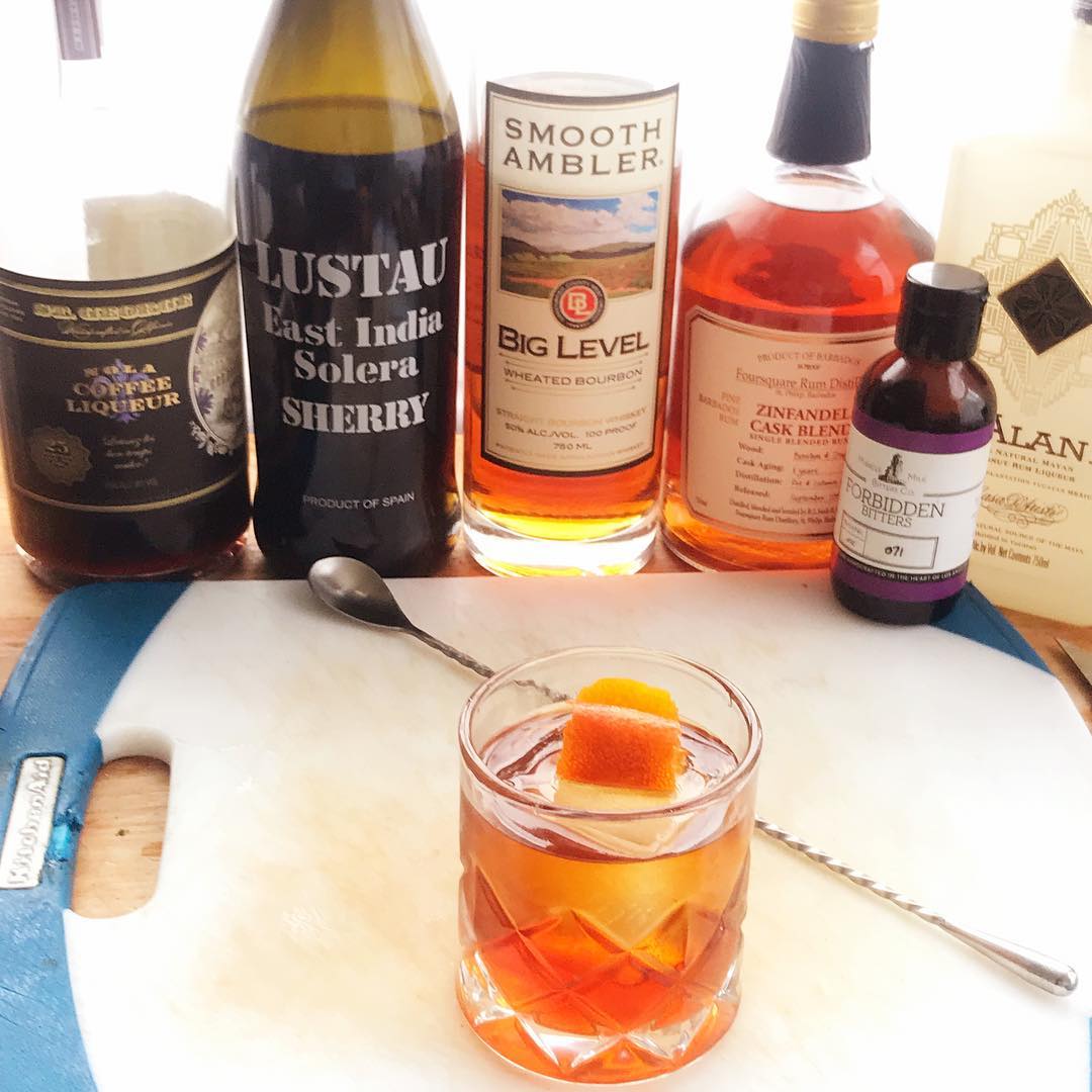 The cinnamon and caramel notes in the overproof bourbon are joined by the dark fruit/molasses notes of the rum aged in Ex-Bourbon and Zinfandel casks and joined by the toffee notes of the sherry blend and coconut and coffee from the liqueurs. The bitters add a bit of spice and the orange twist a pleasant aroma