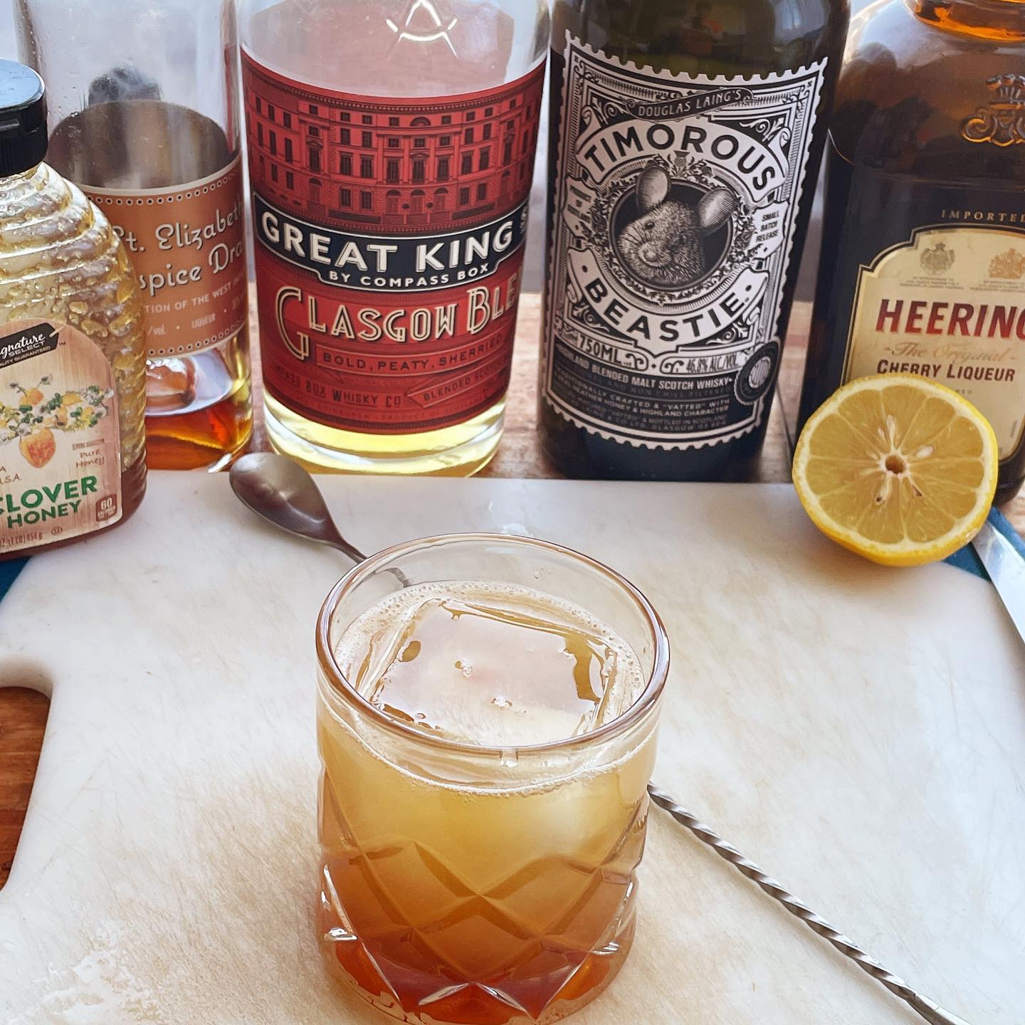 The honey, cereal grain, and subtle peat notes from the blend of scotches works nicely with the comforting combination of flavorful honey syrup and bright lemon juice while the allspice liqueur adds a note of baking spices and the float of cherry liqueur adds a hint of fruit to each sip