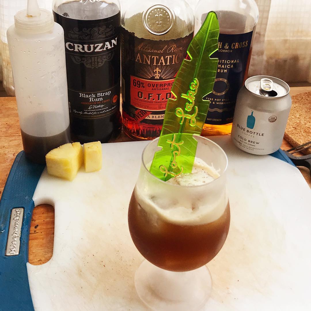 The heavily molasses based Blackstrap rum pairs nicely with the coffee, rich simple syrup, and grated nutmeg to bring a rich, bittersweet flavor reminiscent of a nice breakfast while the pineapple juice works with the funky Jamaican rum and the Overproof rum blend to add tropical aromas and flavor while also lightening the drink