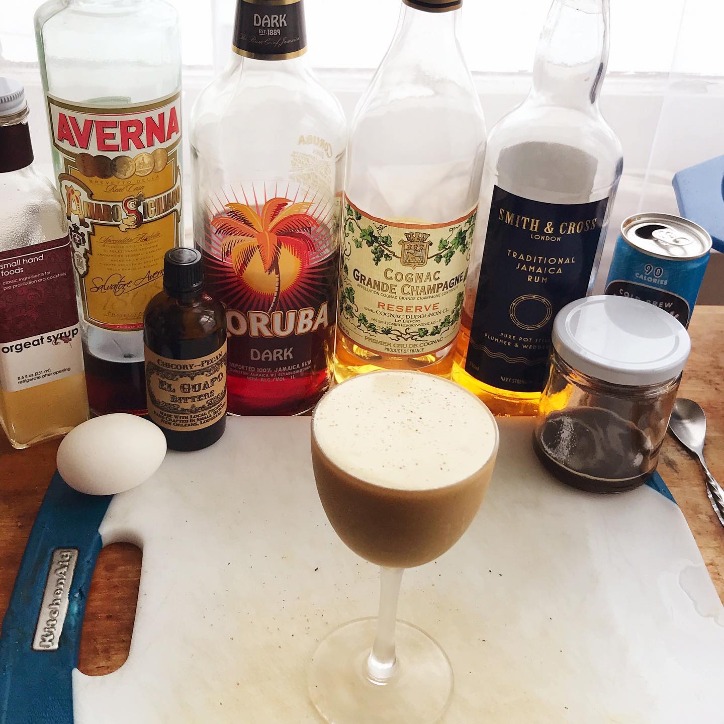 A rich, comforting bittersweet Flip/Egg Nog riff from excellent Chicago bar Lost Lake’s Jinglebell Square Holiday menu ☕️ The bittersweet coffee flavors in the coffee syrup and cold brew work nicely with the caramelized sugar notes in the cognac and the molasses and tropical fruit notes in the blend of rums. The Sicilian Amaro boosts the bittersweet notes of the coffee while adding some spice while the Orgeat adds notes of almond and a hint of vanilla and the egg lends richness and a smooth mouthfeel