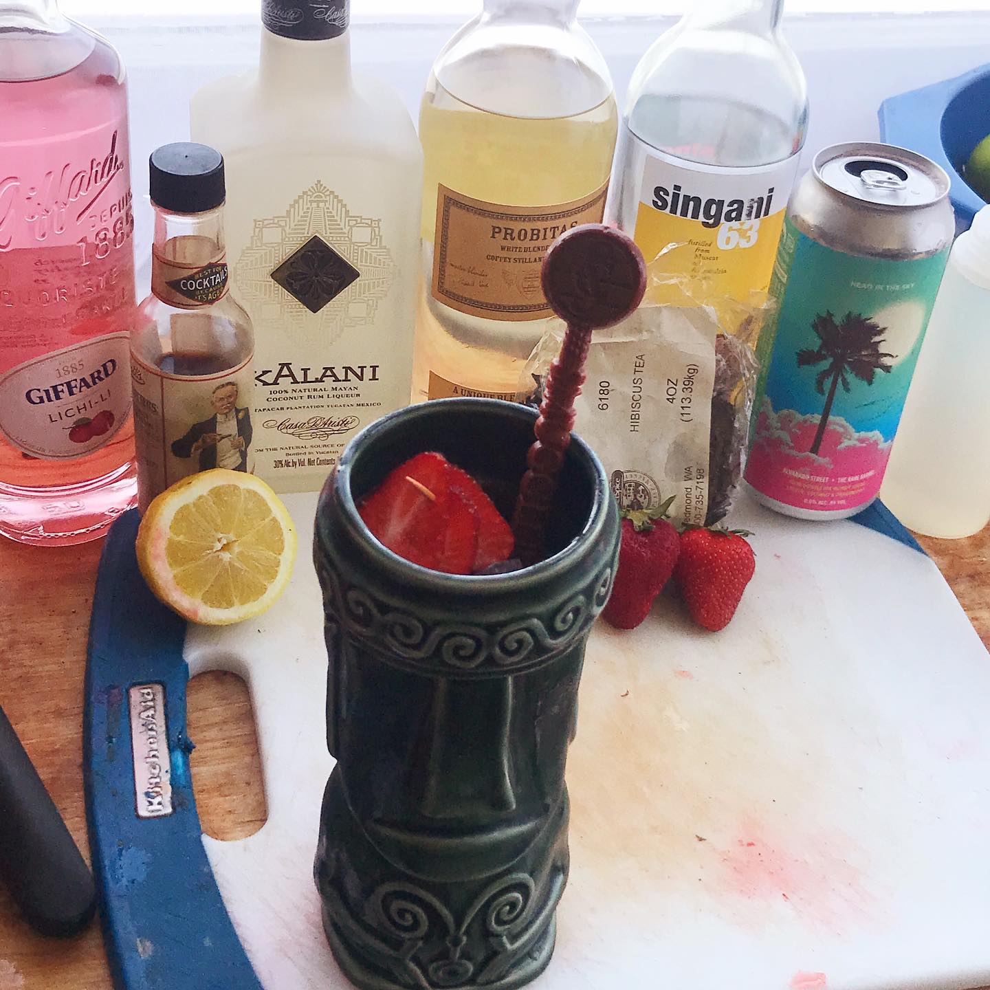 A refreshing, floral rum punch riff/beer cocktail with strawberry, coconut, lychee, and hibiscus 🍓🥥🌺 The hibiscus-infused Jamaican/Barbados rum blend provides a base with plenty of tropical fruit and floral notes which work very well with the fresh strawberries and the Sour IPA with coconut, lychee, and dragonfruit. The Bolivian brandy echoes the floral notes and the coconut and lychee liqueurs boost the flavors in the beer. The spice notes in the bitters tie everything together