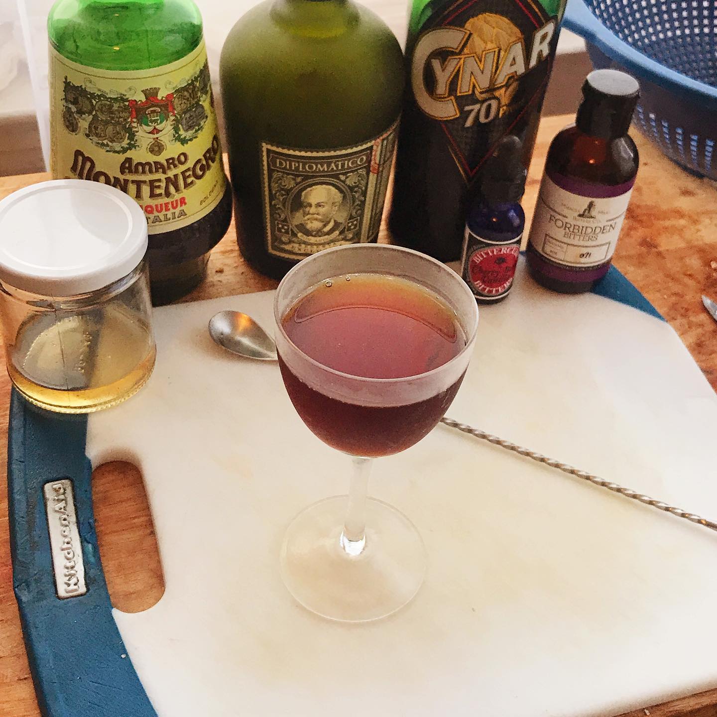 A layered, bittersweet rum Manhattan riff with hints of baking spice, cocoa, and dark fruit