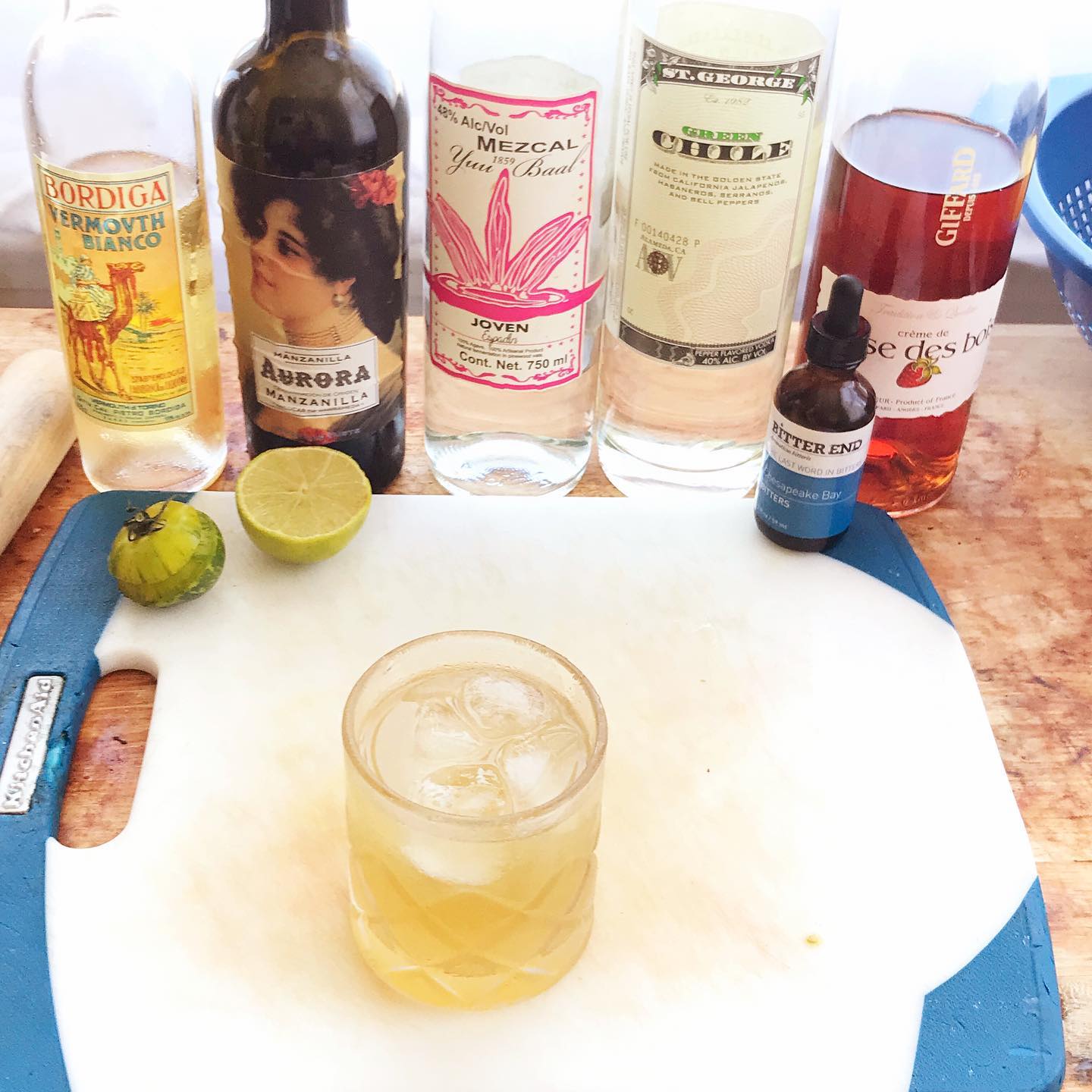 A savory, yet refreshing Margarita riff that highlights some late summer garden ingredients, including the delicious Green Zebra tomato 💚 🦓🌶 The muddled green zebra tomato brings a bit of fresh, tart flavor with a hint of spice that pairs well with the smoke notes in the mezcal and the fresh chile flavor of the vodka. The Manzanilla sherry contributes a touch of saline and green apple while also drying out the drink a bit. The addition of the blanc vermouth with a bit of strawberry liqueur introduces another flavor that complements the tomato while rounding out the drink. The lime juice balances the acidity while the bitters bring some black pepper and bay leaf notes and a pinch of salt makes the flavors pop