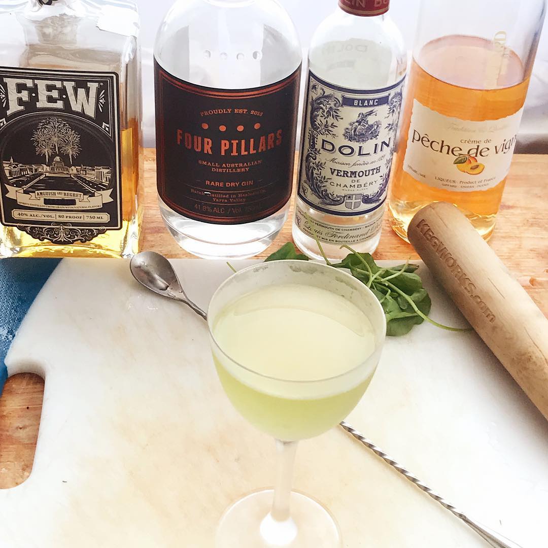 Muddling the watercress in the vermouth imparts a peppery note to the drink that works very well with the juniper and other botanicals in the gin and the floral and bittersweet notes in the Malort. The addition of a bit of peach liqueur adds a subtle counterpoint of fruit, much like adding dried apricot or cranberry to a salad with bitter leaves helps add contrast. The vermouth softens and rounds out the drink while bridging the flavors.