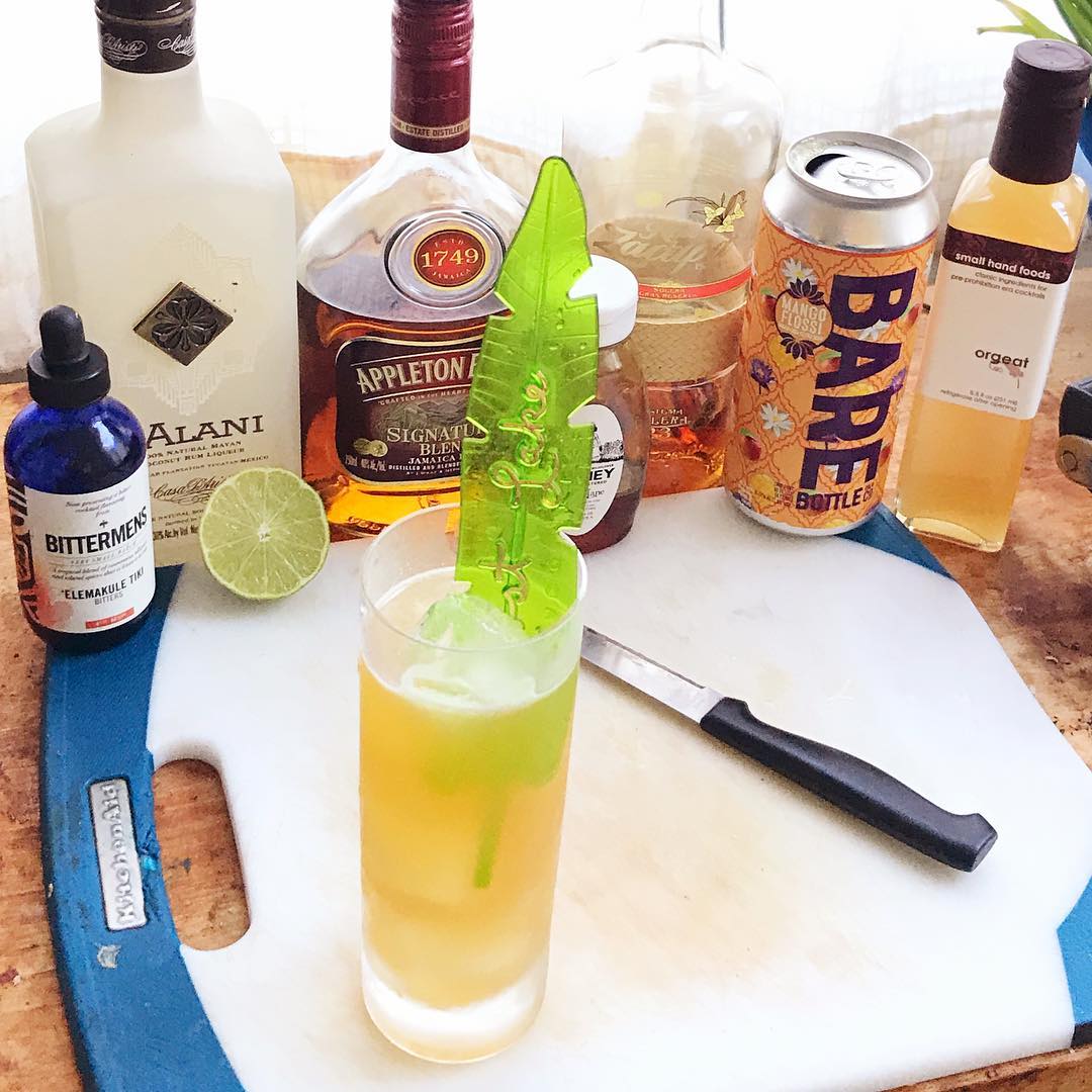 Shake with ice and strain into a chilled Collins glass with ice cubes. Top with 2 oz mango kettle sour beer (can probably use .5 oz Mango Brandy and 1.5 oz hazy IPA as well). Garnish with a swizzle stick