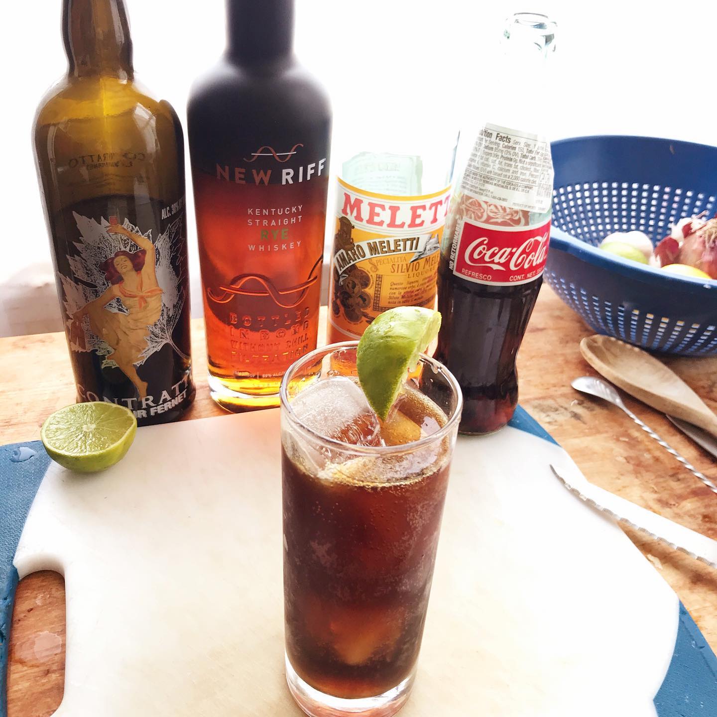 The cola notes in the mildly bittersweet Amaro Meletti and spice and floral notes in the more bitter Fernet make wonderful foils to the Coca Cola. The rye brings notes of cinnamon and vanilla that are nice accents and the squeeze of fresh lime juice balances the acidity and brings some zip. Very refreshing!