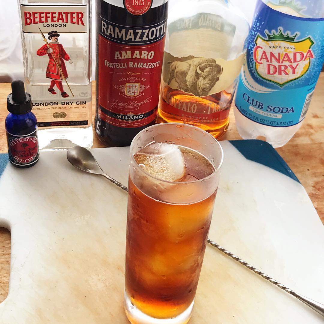 The kola nut and botanicals/spices in the Ramazzotti are reminiscent of a Dr Pepper crossed with a touch of root beer. When combined with the subtle orange notes in the bourbon and the juniper in the gin, the mixture takes on the flavors of a Coke spiked with a bit of whiskey. The Bitters and Club Soda give the drink some lift and effervescence